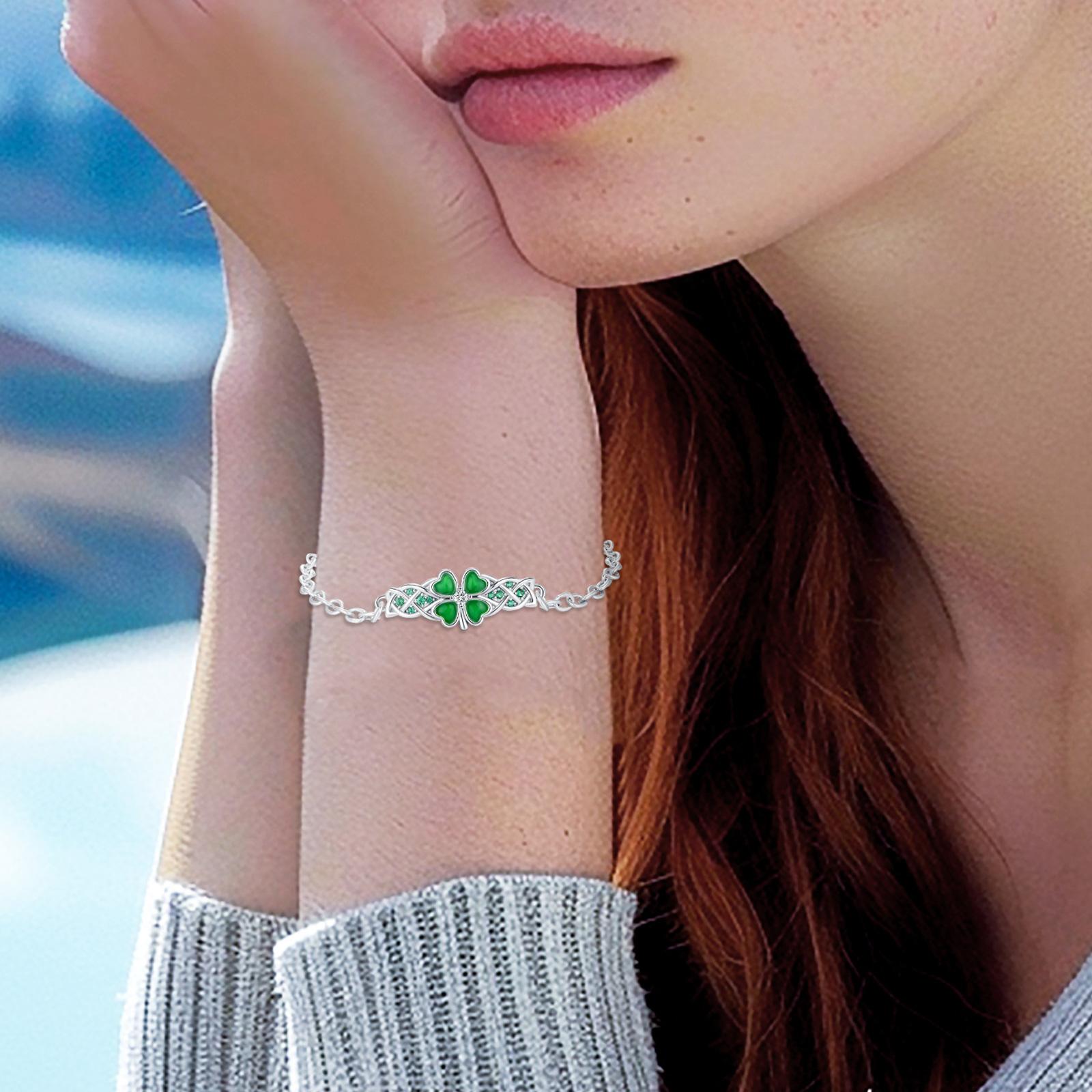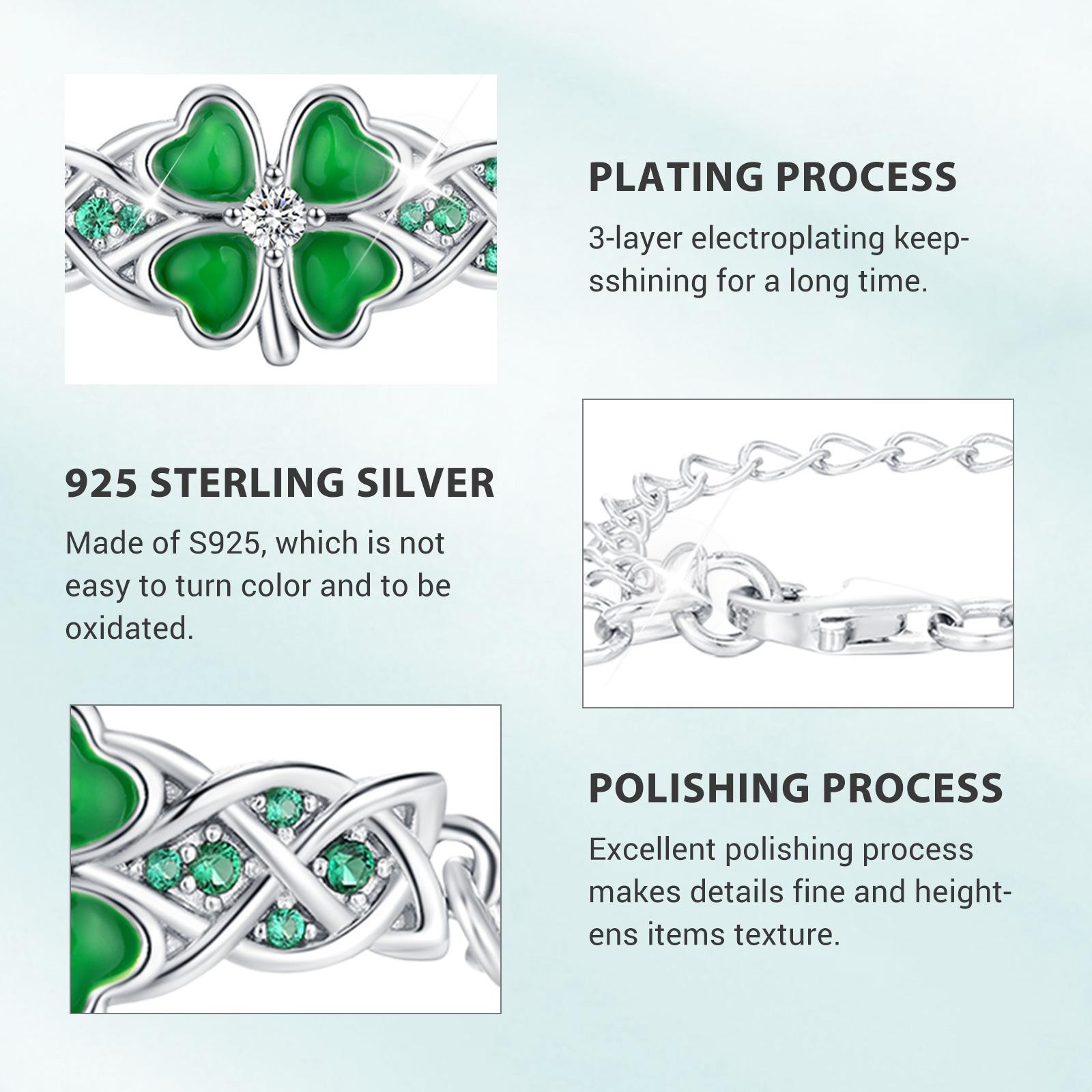 A subtle nod to Irish heritage, this slender bracelet pairs a gleaming S925 chain with an emerald‑green four‑leaf clover—each heart‑shaped leaf symbolizing hope, faith, love, and luck. Lightweight and nickel‑free, it layers effortlessly with everyday pieces while carrying a timeless message of protection.