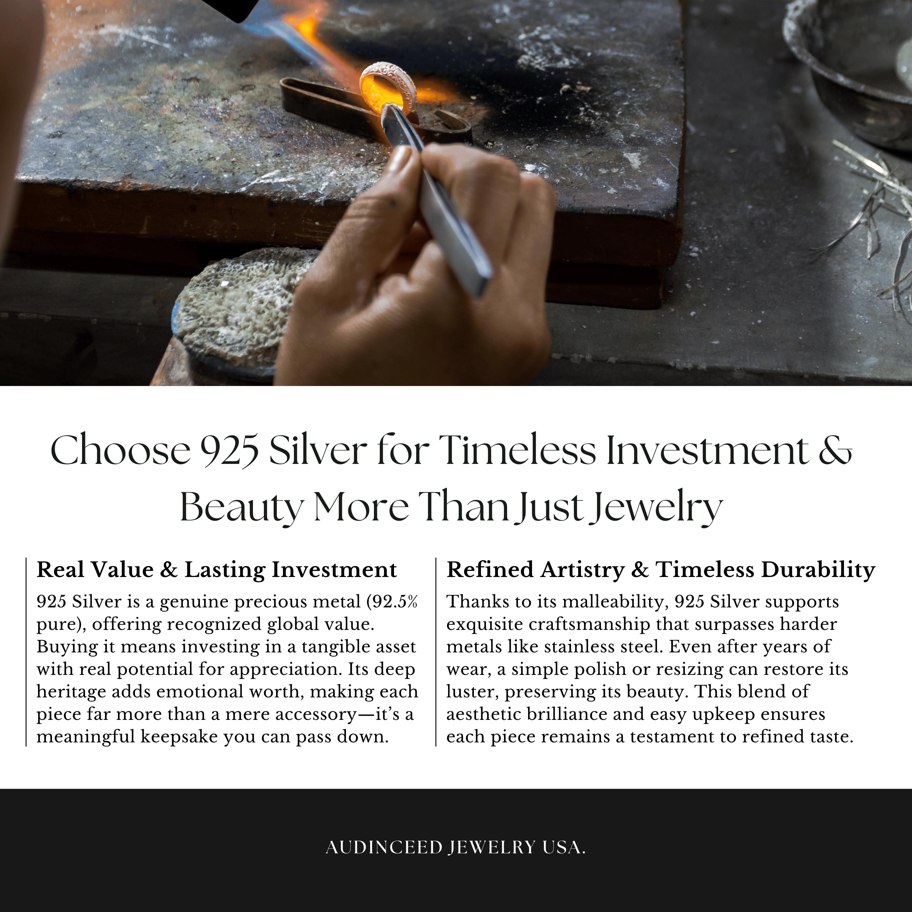 • S925 silver is denser and far more durable than stainless steel, offering long‑lasting shine that never looks cheap.
