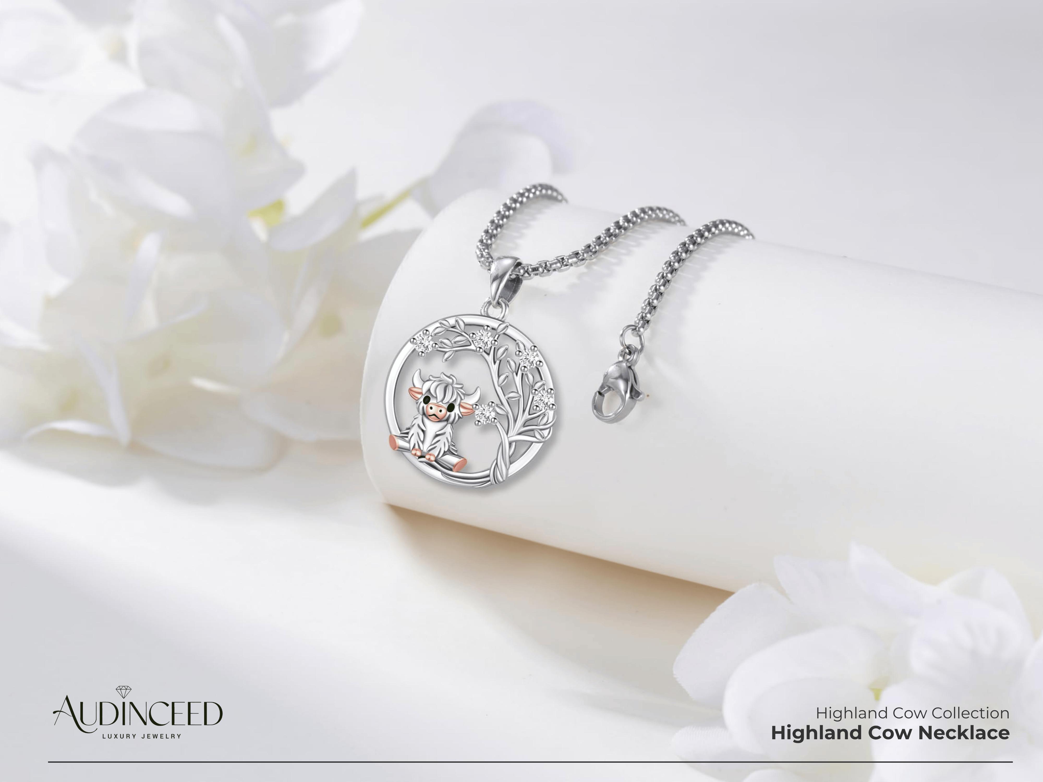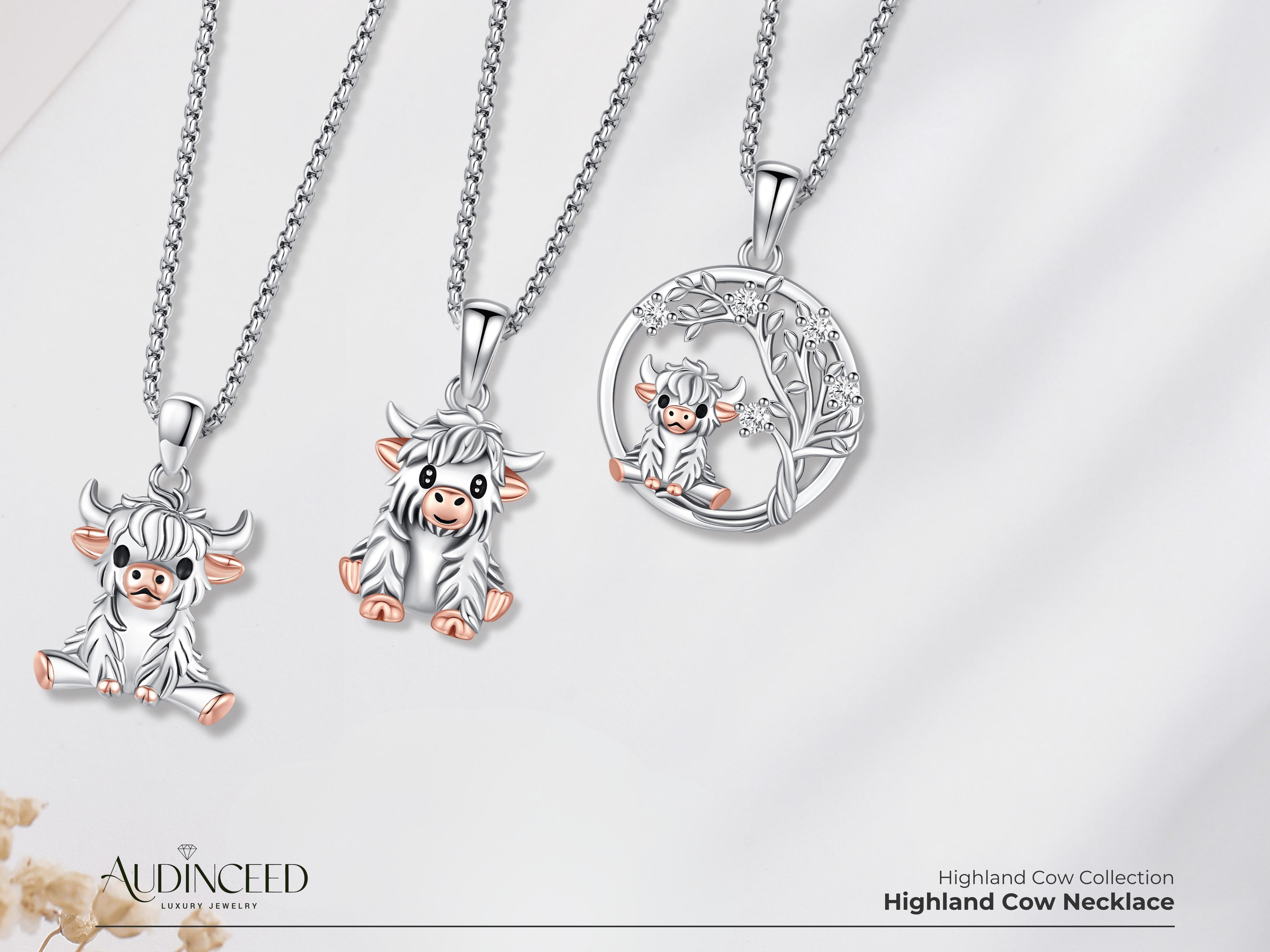 Audinceed Highland Cow Necklace, S925 Sterling Silver Luxury Necklace Pendant Blessed Jewelry Birthday Anniversary Gift for Animal Cow Lovers Woman Wife Girl Man Boy Teen