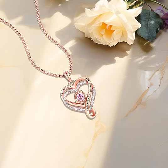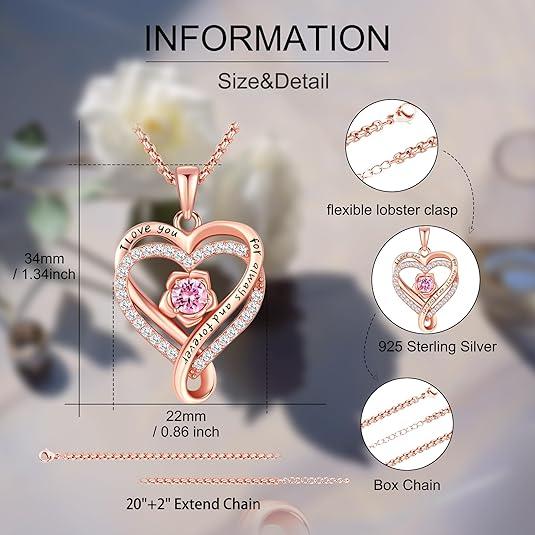 A double heart infinite symbol design with a rose birthstone embedded in the middle, engraved with the words "I Love You for Always and Forever". The design of this necklace symbolizes eternal love for each other.