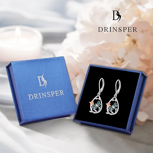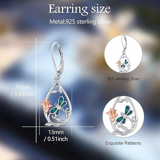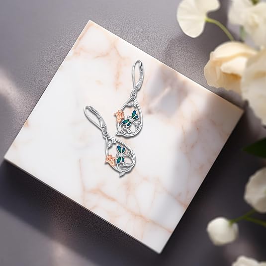 Graceful 925 sterling silver drop earrings featuring a vibrant enamel dragonfly, rose gold-toned flowers, and sparkling accents. Lightweight with secure lever-back closures, perfect for adding elegance to any look.