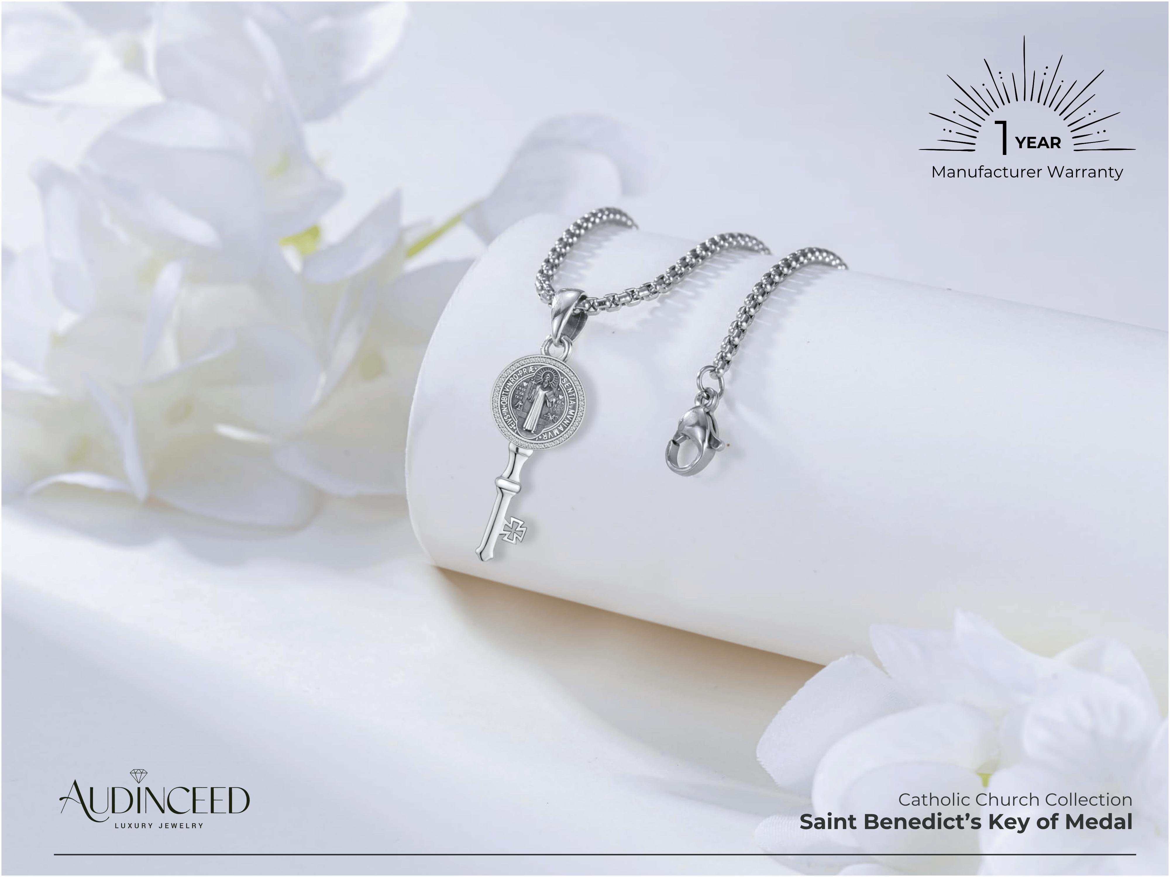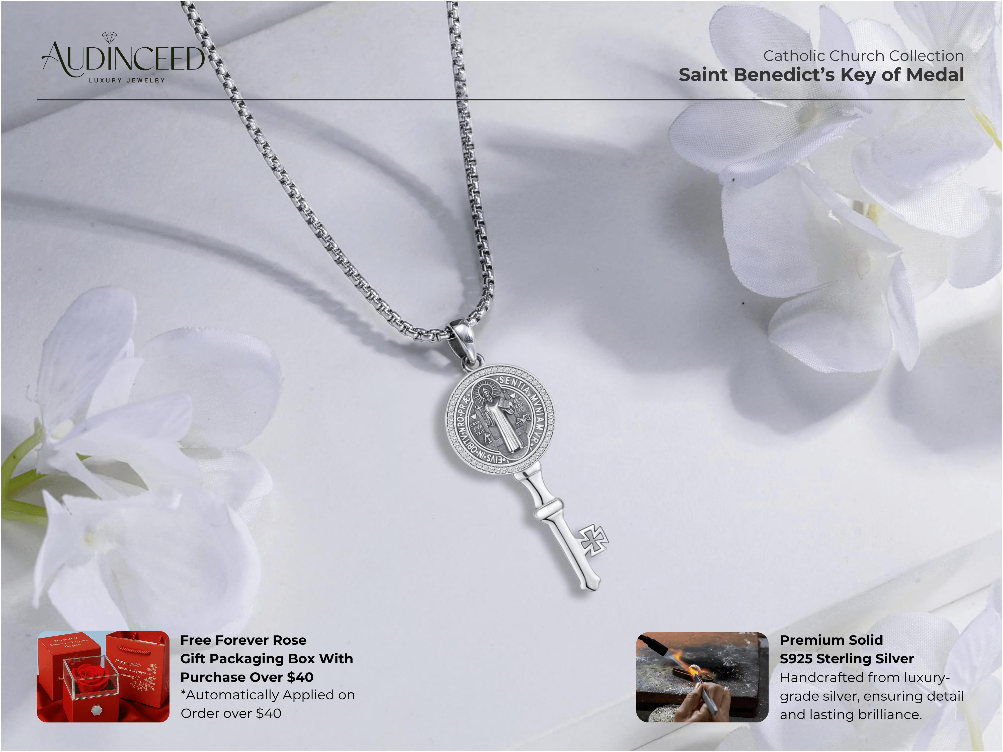 - Material of San Benito MedallaThe St. Benedict key pendant is made of 925 sterling silver, ensuring quality and durability. This Catholic exorcism medallion is free from nickel, lead, and cadmium, making it a safe, high-quality piece.It is designed to maintain its luster and strength over time.